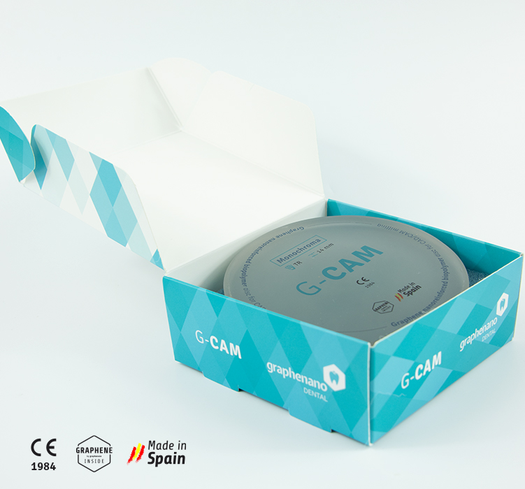 Los discos de biopolímero nanorreforzado con grafeno G-CAM presentan un aumento de la flexibilidad y de la dureza superficial. Su peso específico es igual al de la dentición natural. Permiten una distribución equitativa de la carga masticatoria y la absorción de las cargas oclusales externas.